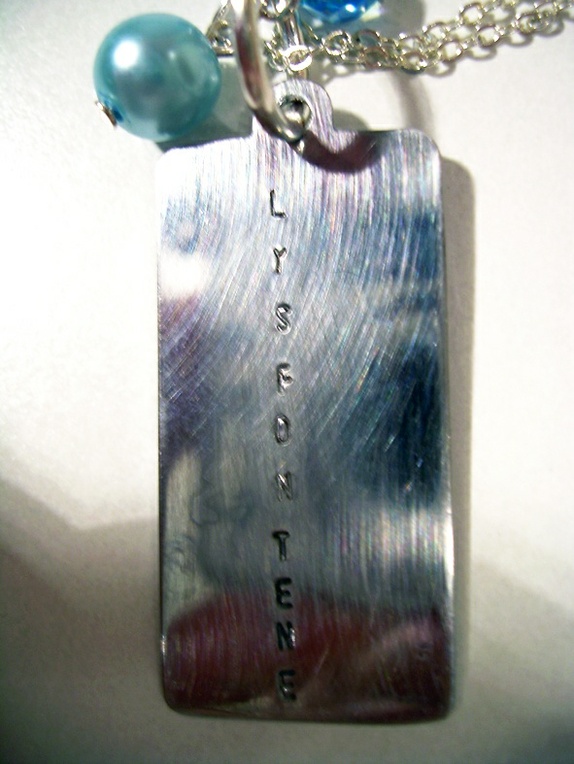 Søkeord: tag, dogtag, blå, sølv, ord, tekst, skrift