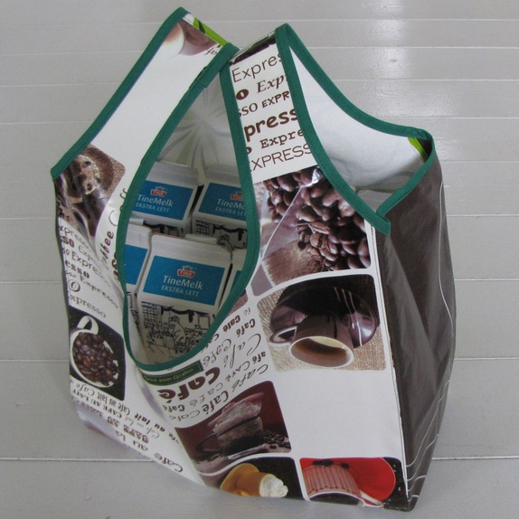 Posen er sydd etter modell av de i plastikk og rommer utrolig mye - du får enkelt en hverdagshandel i en slik - for helge- og høytidshandel trenger du nok noen flere. Den er mye mer behagelig å bære enn engangsposene og du slipper å engste deg for at posen ryker selv om du har handlet melk til hele familien (den rommer minst 8 liter).