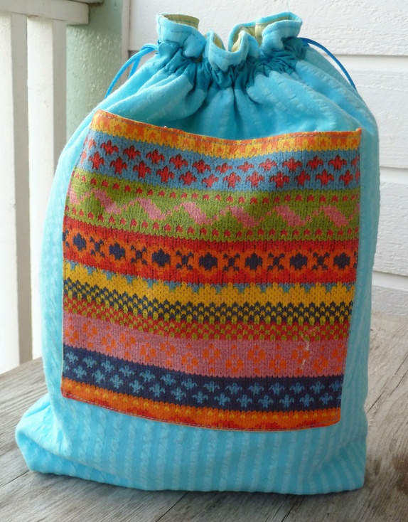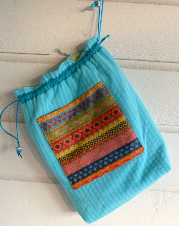 Veska er laga i lillemartinestoff med ei stor lomme framme. Lomma er decoupage på lin.