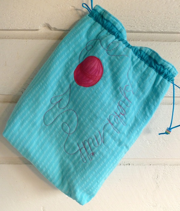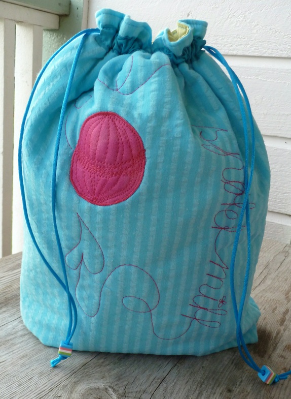 Applikert nøste og frihandsbrodert tekst på baksida.