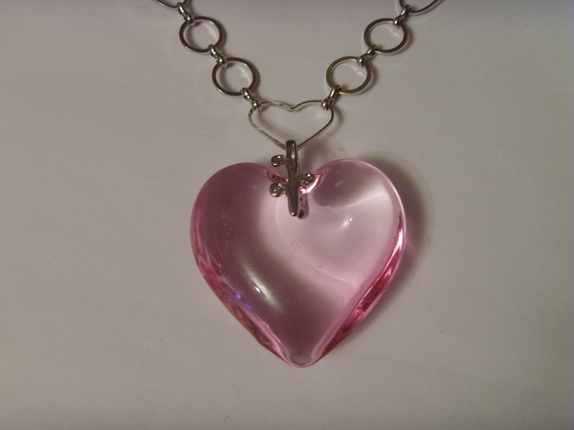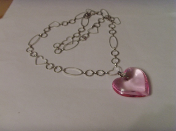 Enkelt smykke med rosa glasshjerte. Hjertet er ca 4cm stort . Kjedet er uten lås.