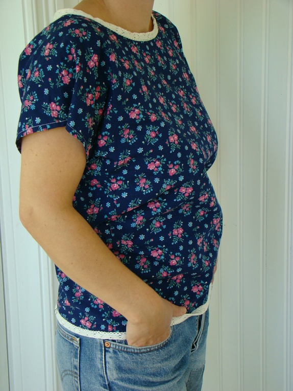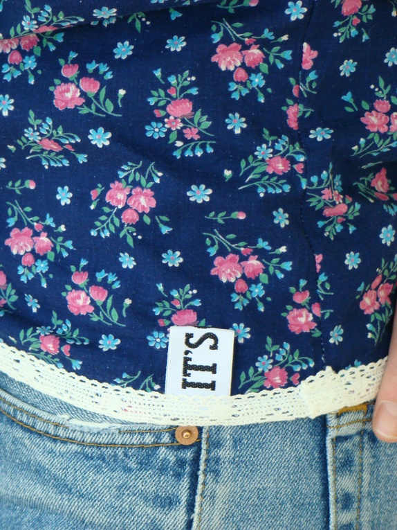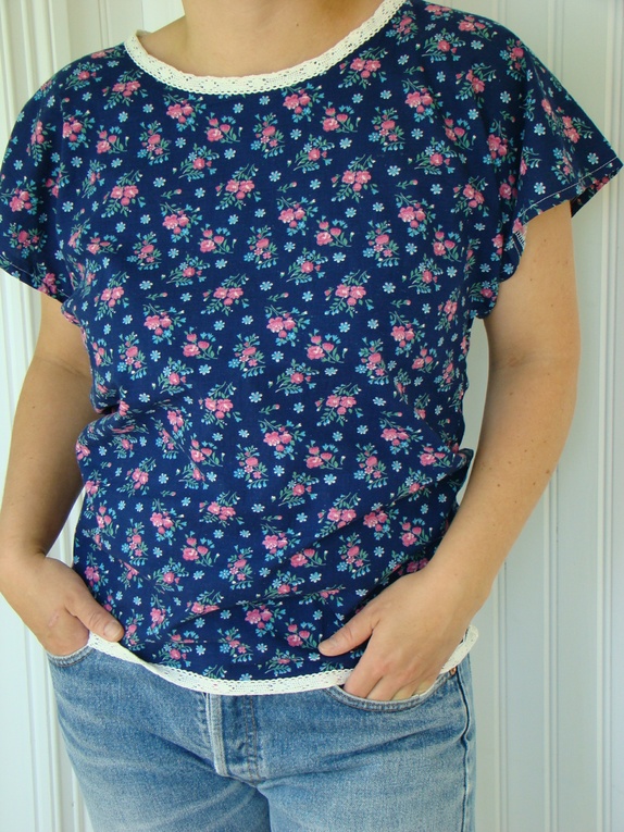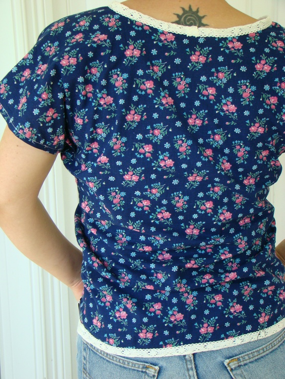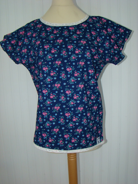 Topp sydd av blått bomullsstoff med blomster i rosa og hvitt. 100% bomull. Påsydde heklede bånd rundt hales og nede på kanten. Ermene er løse og "flagrende" i "kimono- stil". Denne toppen passer flere størrelser og er kjøpt fra jenter i størrelse S til L. Modellen på bildet er størrelse M/L.