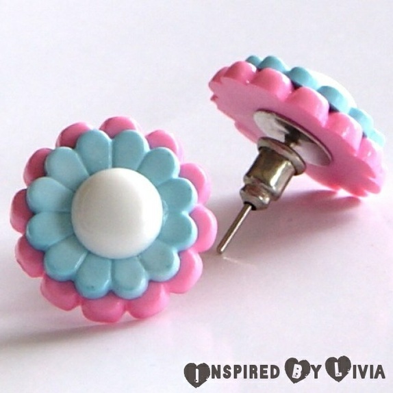 Blomsterøredobber i pastellfarger satt på stift - laget av knapper.