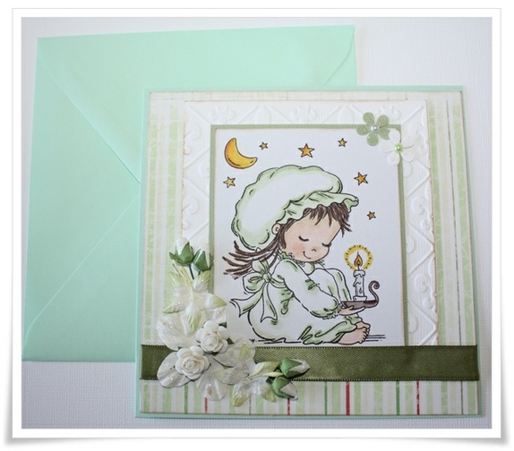 Kortet er i 13x13 str og levers med farget konvulutt . Dette kortet er kun dekorert på forsidenstemplet er malt med hånd
