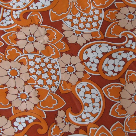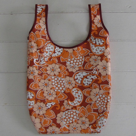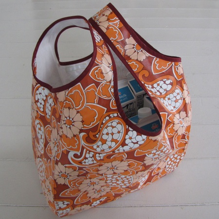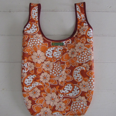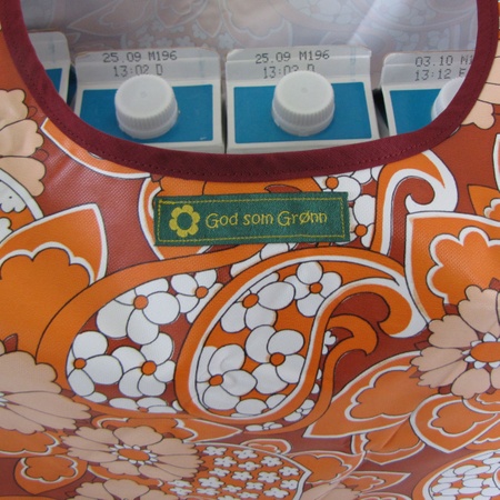 Denne er sydd av en plastduk med morsomt blomstermønster i ornasje og burgunder. Skikkelig 70-tallsmønster. Kantet med burgunder skråbånd og med God som Grønn-merkelapp på baksiden.
