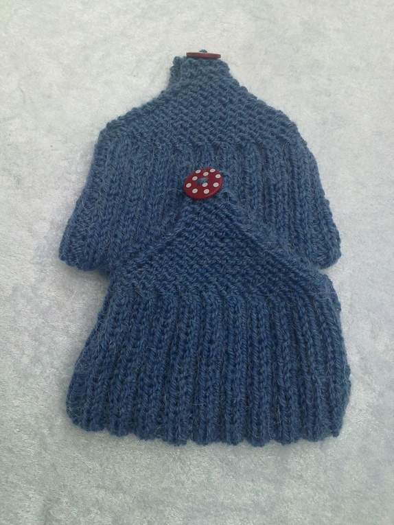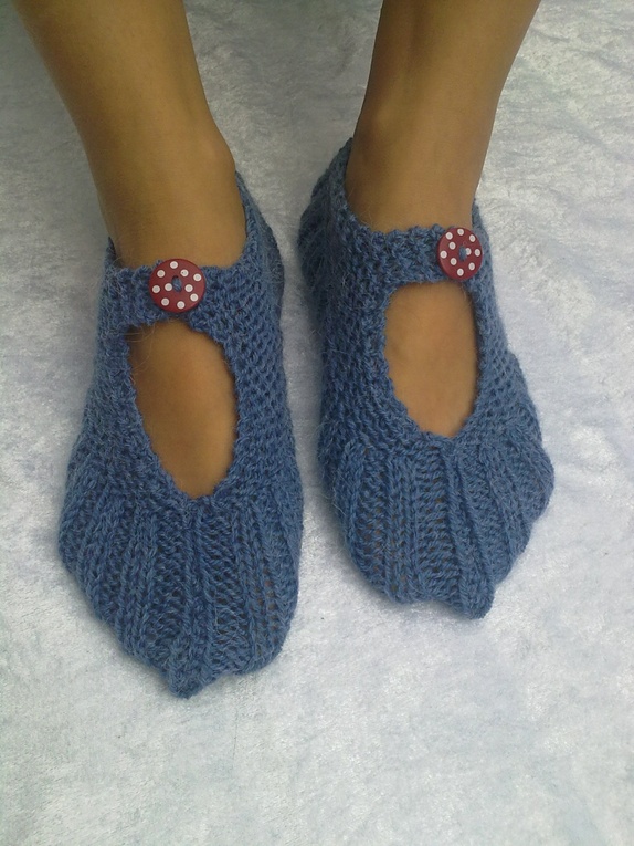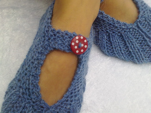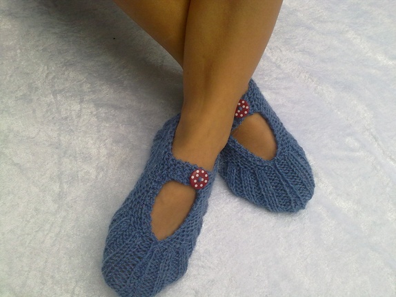 Myke og gode lommetøfler strikket i alpakkagarn, kjekke og ta med seg bort eller som en liten gave til noen. kan brukes sommer som vinter.farge mellomblå med rød knapp med hvite prikker.Str. 37-40
