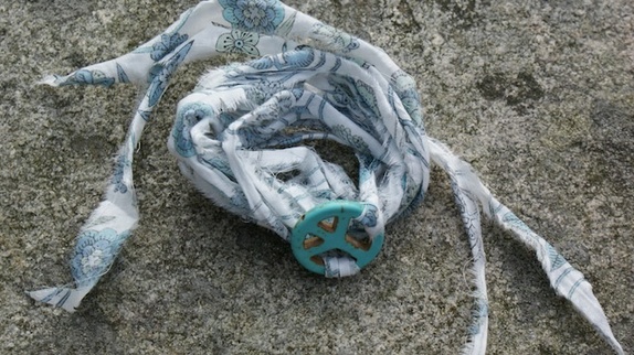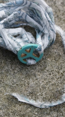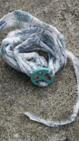 Revet Liberty tekstil, ligger dobbelt og måler da 2 x68 cm. Peace tegnet er av sten og har en diameter på 2,5cm.