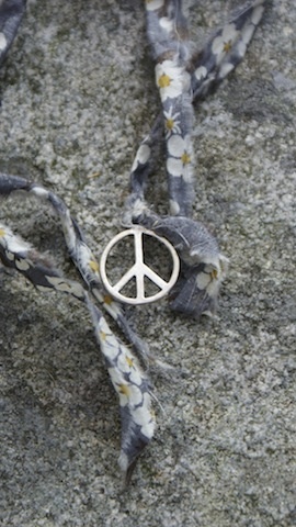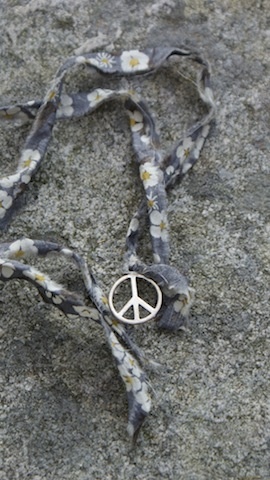 Revet Liberty tekstil med peace tegn. Diameter 1,8cm. Snos rundt håndleddet og knytes.