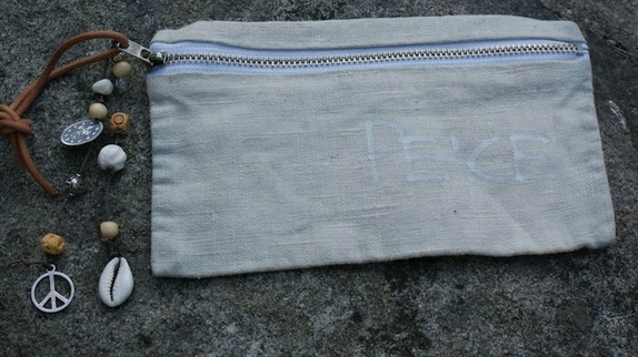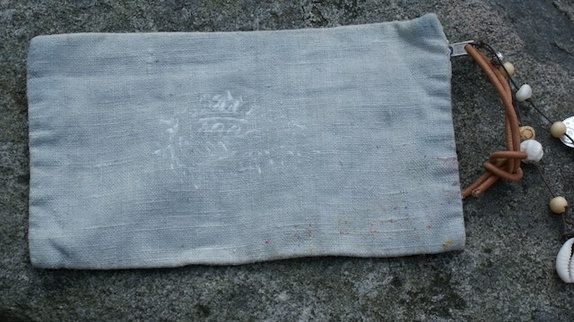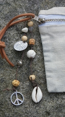 Laget av lin, fôr er av bomull. Håndfarget og med trykket-og/eller skrevet dekor på. Skinn stråp som bare blir finere og finere ved bruk. 2 x snorer med forskjellige perler/ stener/ tegn etc.