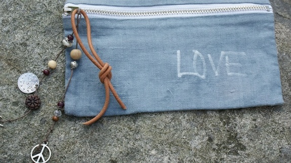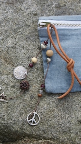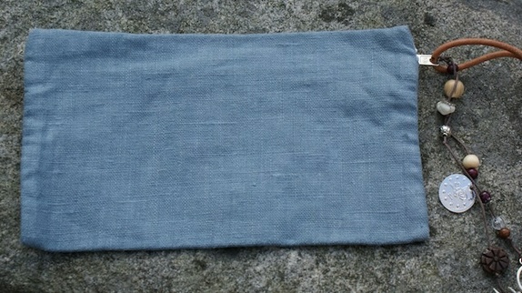 Laget av lin, fôr er av bomull. Håndfarget og med trykket-og/eller skrevet dekor på. Skinn stropp som bare blir finere og finere ved bruk. 2 x snorer med forskjellige perler/ stener/ tegn etc.