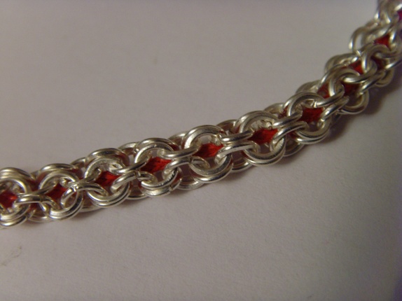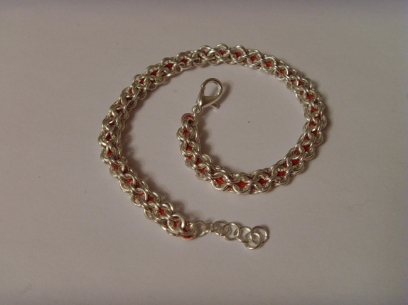 Armbåndet er laget av nikkelfrie små øsken. I midten av armbåndet er det en rød bomullstråd.