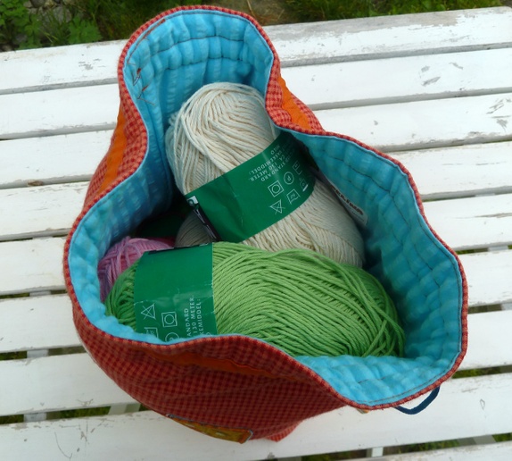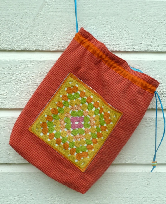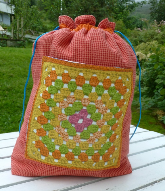 Veska er laga i lillemartinestoff med ei stor lomme framme. Lomma er decoupage på lin.