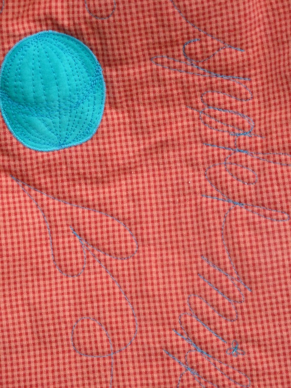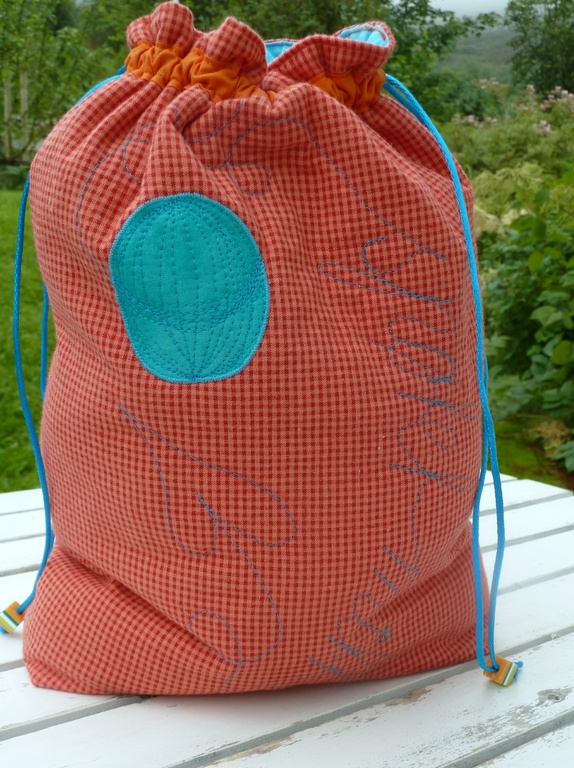Applikert nøste og frihandsbrodert tekst på baksida.