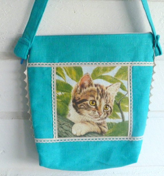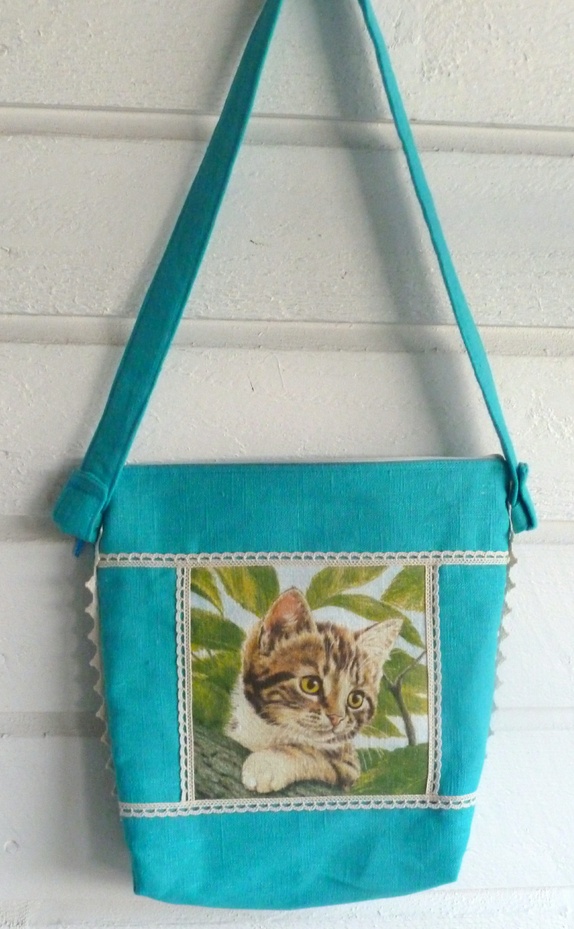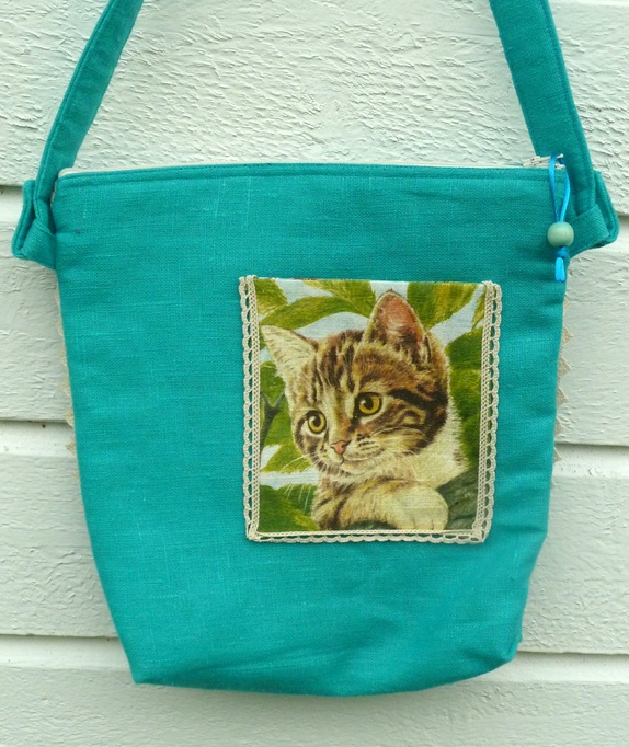 Veske sydd i lin. Decoupagemotiv på framsida.