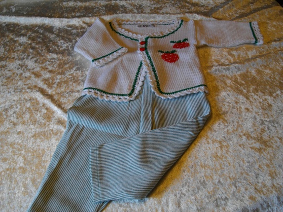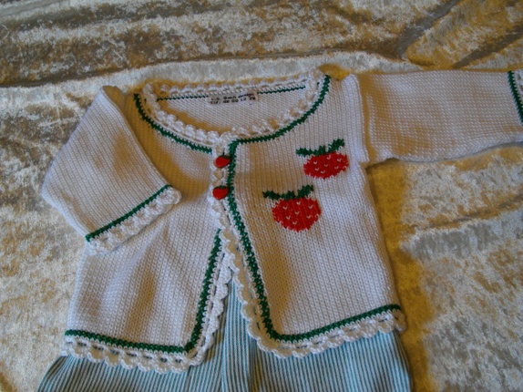 Jordbærpiken er et sett hvor både jakke og bukse er i 100% bomull. Jakken er håndlaget og dekorert med heklekanter, broderte jordbær og jordbærknapper. Buksen er sydd av bumuldstvill i hvit bunnfarge med smale grønne striper i samme farge som den grønne dekoren på jakken. Begge kan maskinvaskes ved 60° og tørkes i tørketrommel.