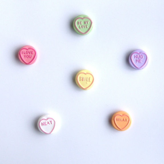 Er på størrelse med ekte LoveHearts. Ca. 2cm i diameter. Du får 6 forskjellige magneter. Dvs. 6 forskjellige farger - Alle med forskjellig tekst, hvilke tekster du får kommer an på hva jeg har som er ferdig laget. Har du spesielle ønsker? Ta kontakt så ser vi hva vi kan få til :)