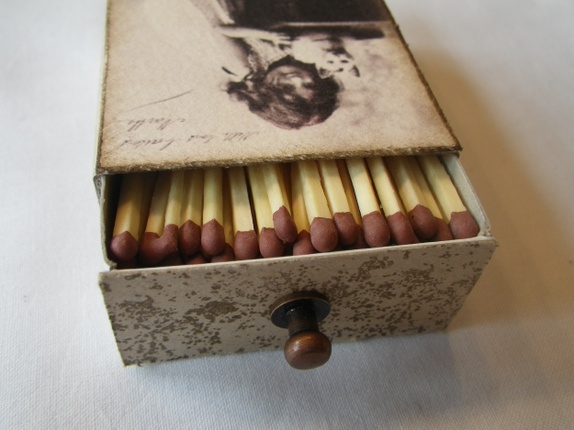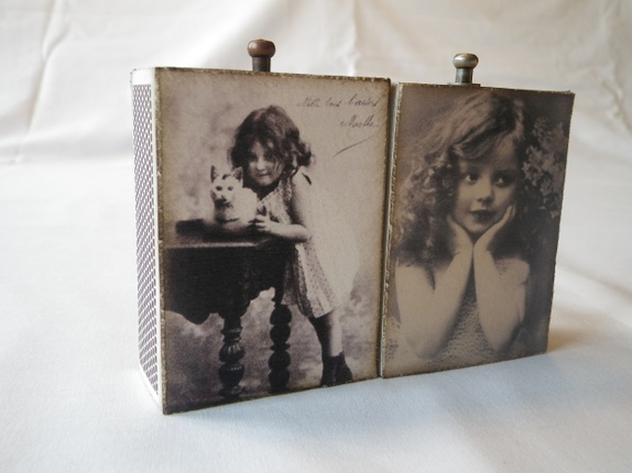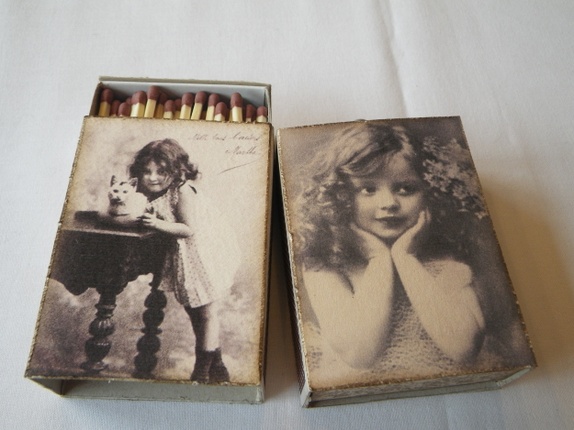 Fyrstikkeskene er pyntet med vintagebilde,samme motiv på begge sider. Alle kanter er svertet med distress.