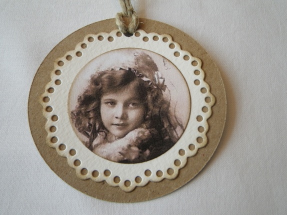 Laget av kraftkartong og akvarellpapir. Pyntet med vintagebilder.