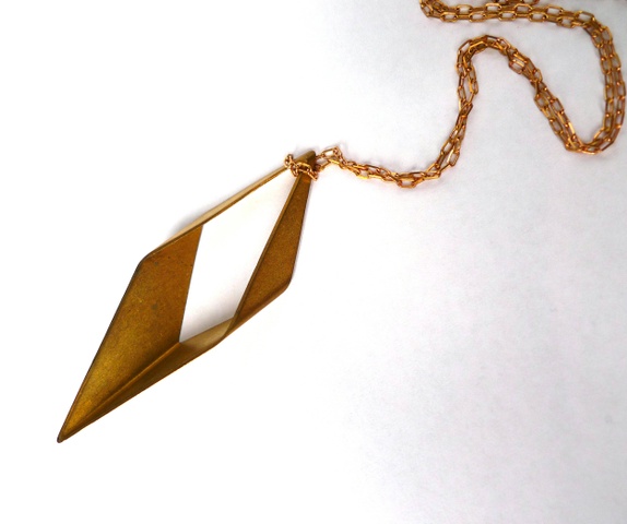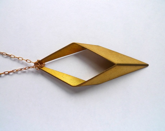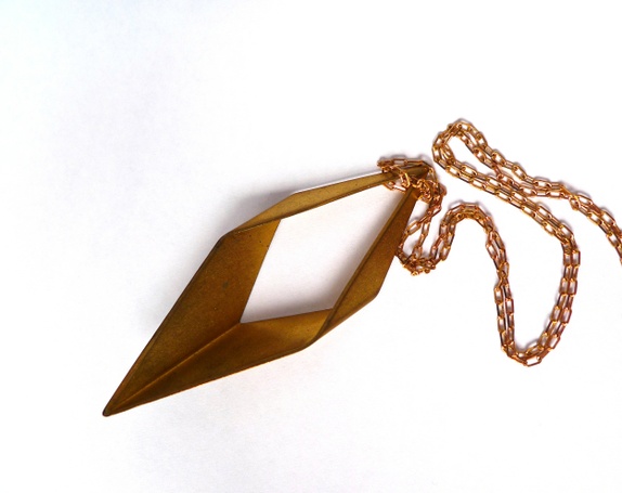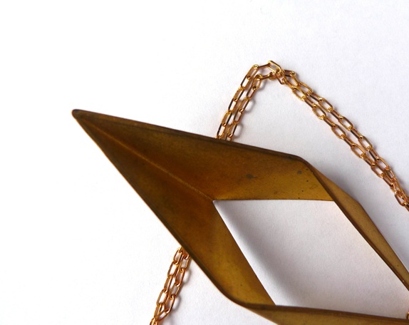 [Tags: halssmykke, rombus, 3D, tredimensjonalt, vintagesmykke, vintagesmykker, geometri, geometrisk, smykker, kjede, retro, gjenbruk, resirkulert, upcycled, recycled, statement, statementsmykke, kjede, stort, antikk patina, gyllent, gyllen, brunt, metall, metallsmykke, enkelt, moderne, modrn, quirksandcrafts, quirks and crafts, qandc, q and c, Linn Paasche]
