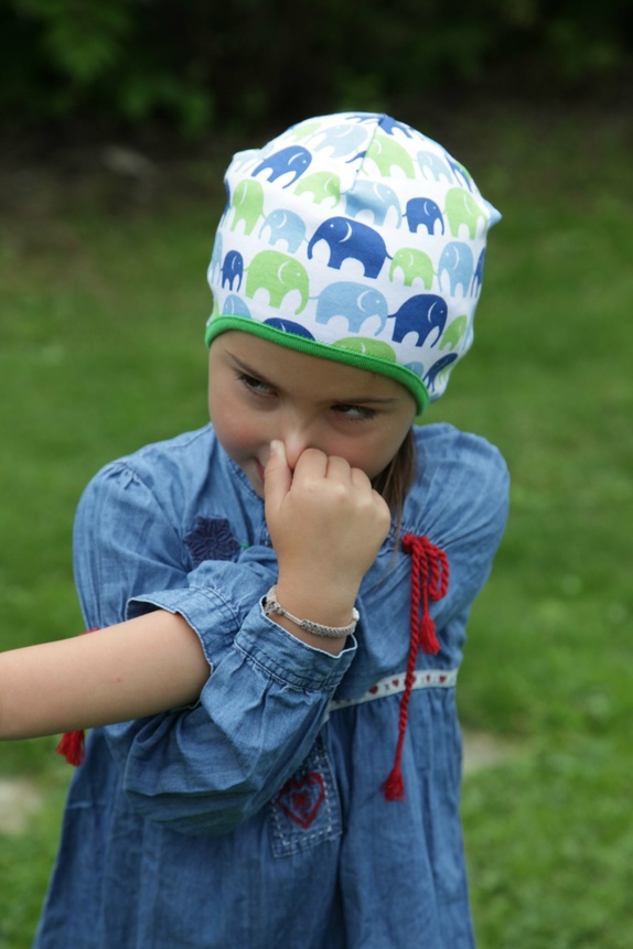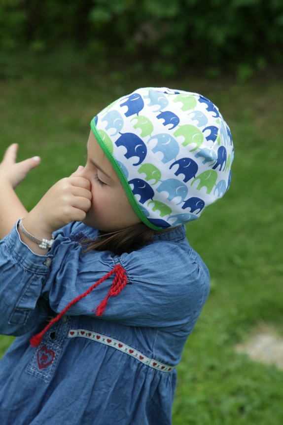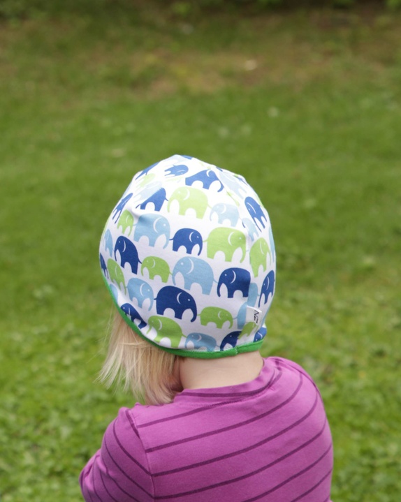 Luen er sydd i en hvit jersey med elefanter marsjerende i grønt og blått. Avslutningen på luen er kantet med en myk grønn jersey. Luen finnes i 4 størrelser: XS, S, M og L.