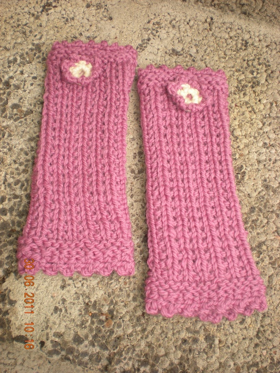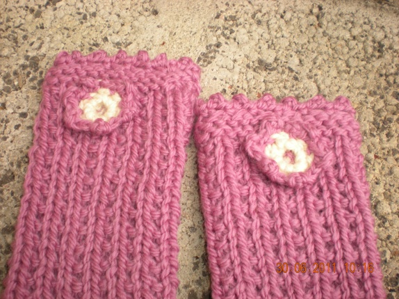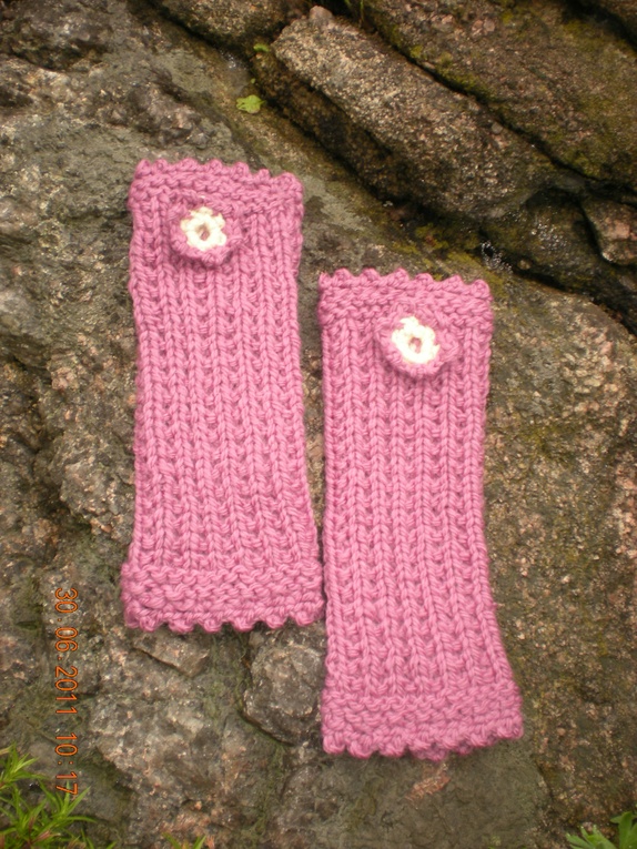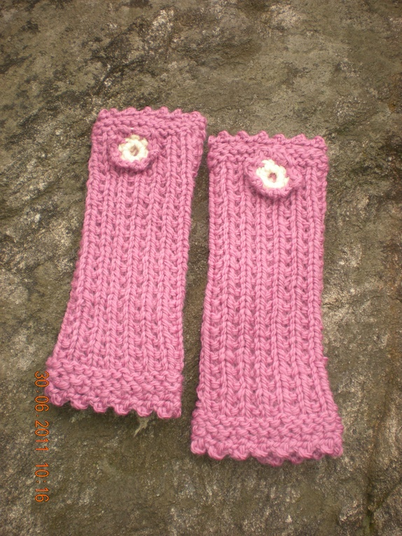 Flotte leggvarmere i rosa med blomst. Det er heklet picotkant opp og nede på leggvarmerene.