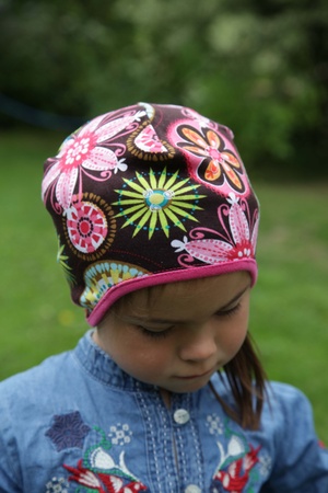 Luen er sydd i en brun jersey med blomster både her og der i rosa, lysgrønt, oransje og turkis. Avslutningen på luen er kantet med en myk rosa jersey. Luen finnes i 4 størrelser: XS, S, M og L.