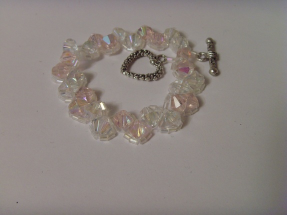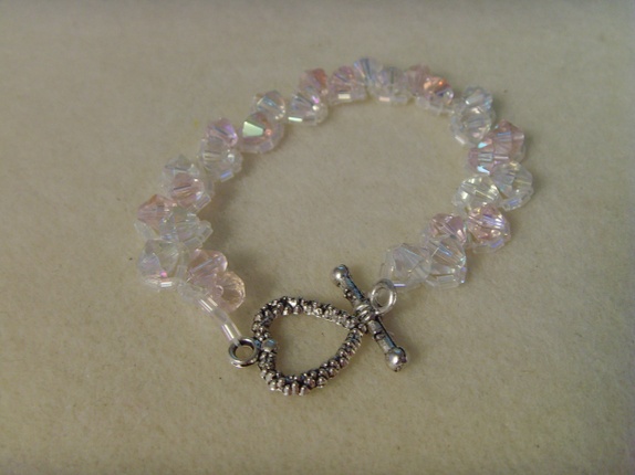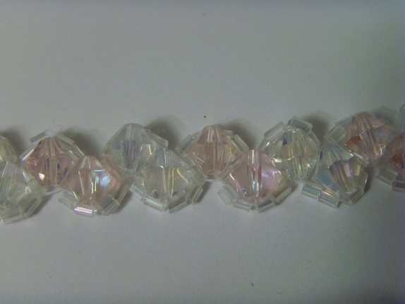 Armbåndet er sydd av mange små seed beads og bikone akrylperler i hvitt og rosa.