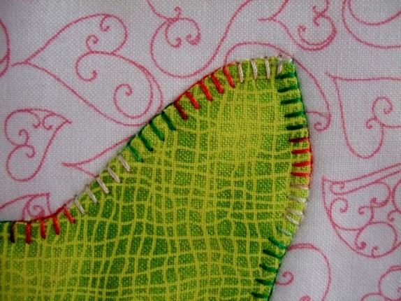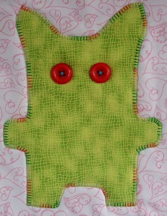 Det knallgrønne monsteret er applikert på et stoff med rosa hjerter.