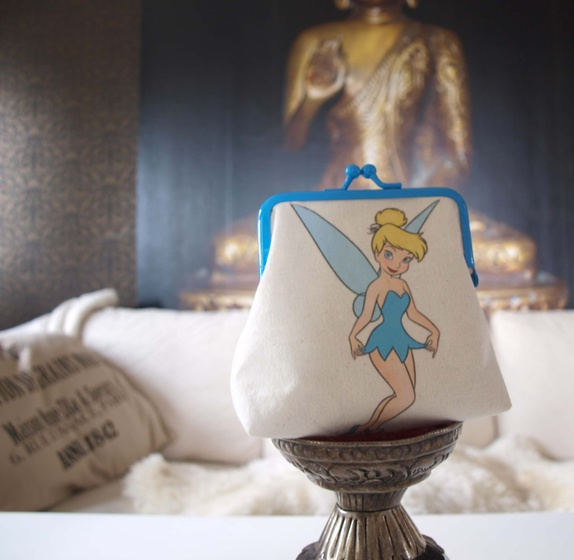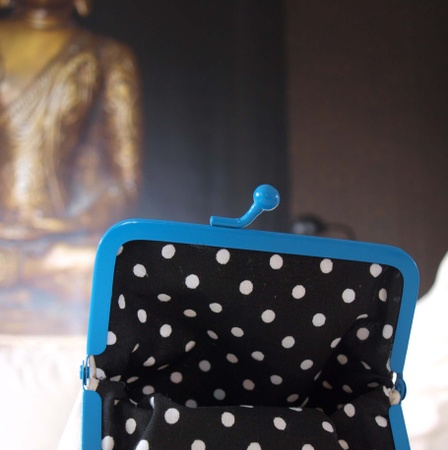 Portemone sydd i bomullstoffmed påstrøket motiv.Foret med sort stoff med hvite prikker vliselin mellom lagene.Veskelås av messing, måler 10,2 cm.Portemone målerpå det bredeste: 12 cmhøyde : 13 cm