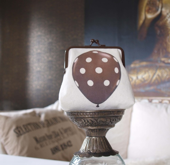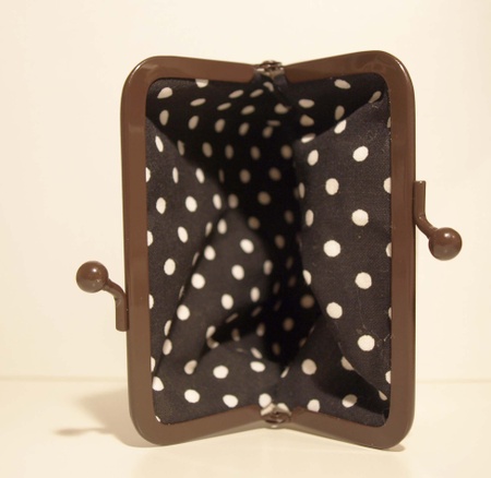 Portemone sydd i bomullstoffmed påstrøket motiv.Foret med sort stoff med hvite prikker vliselin mellom lagene.Veskelås av messing, måler 10,2 cm.Portemone målerpå det bredeste: 12 cmhøyde : 13 cm