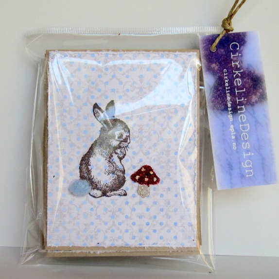Kortene er pyntet med prikkete designpapir, et håndstemplet motiv av en sjarmerende harepus med pompong-hale og en liten fluesopp med mørk rødt og sølv glassglitter.
