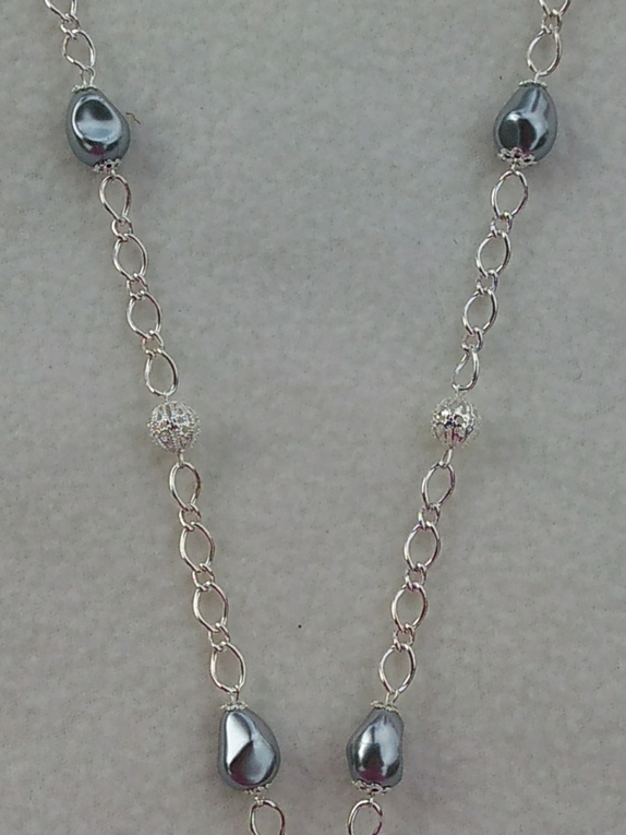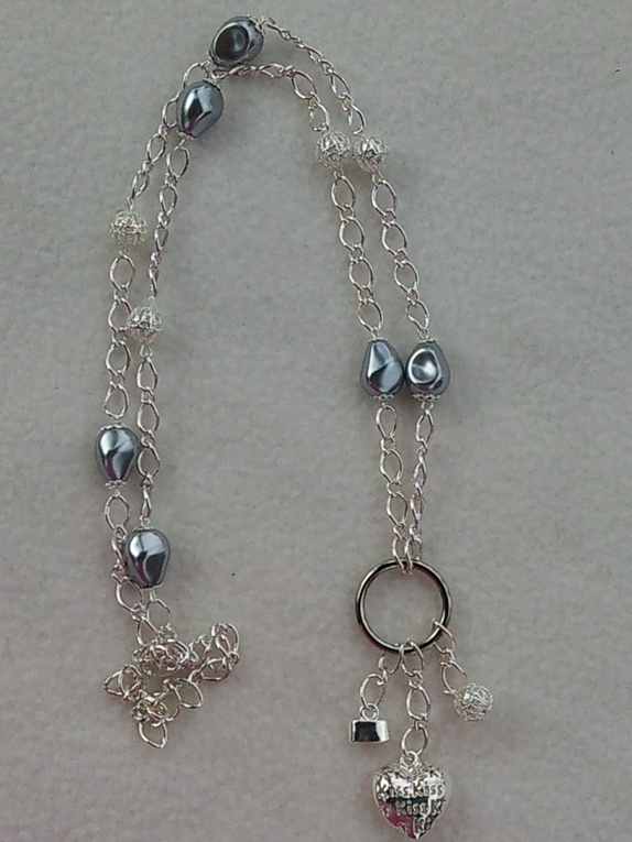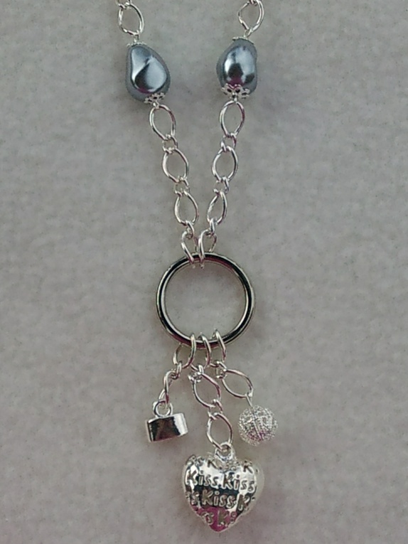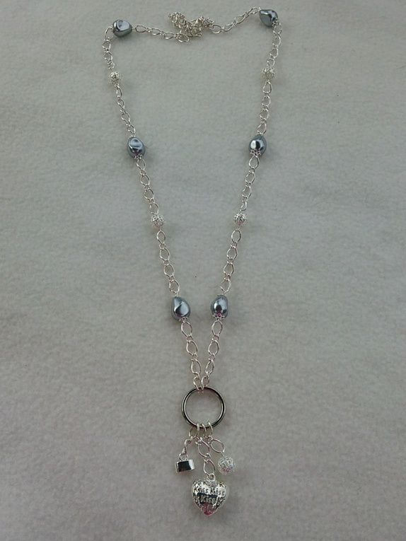 Halskjede laget av lenke og grå voksede glassperler, metallperler og bl.a hjerte-anheng.