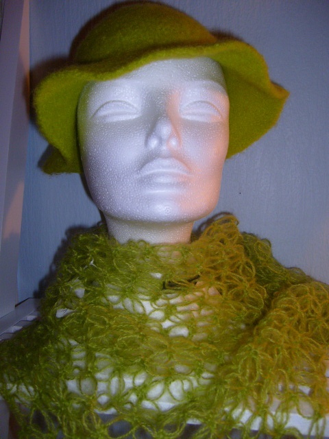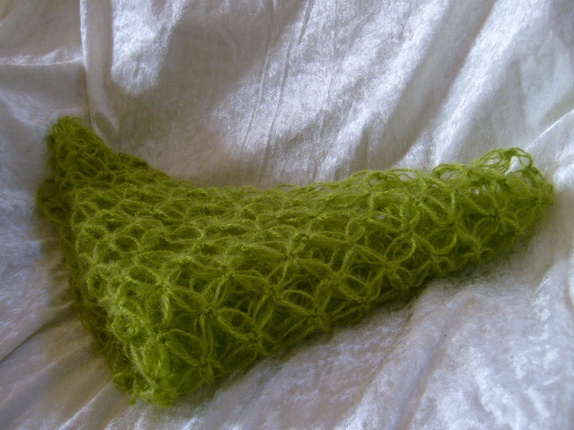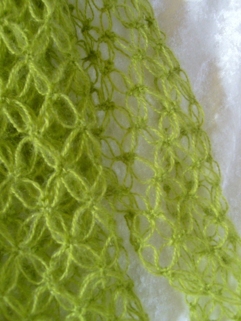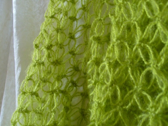 Et herlig og mykt englemaskesjal heklet i nydelig mohair i en frisk limefarge. Et kjempedeilig og lett sjal å kaste over skuldrene eller ha rundt halsen som skjerf.