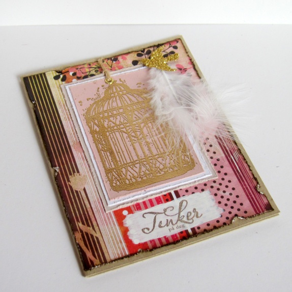 Det er pyntet med flott og fargerikt designpapir, et håndstemplet (embosset) fuglebur i gull, en fjær og en fugl med gull glassglitter. "Tenker på deg" er håndstemplet i sjokoladebrunt.