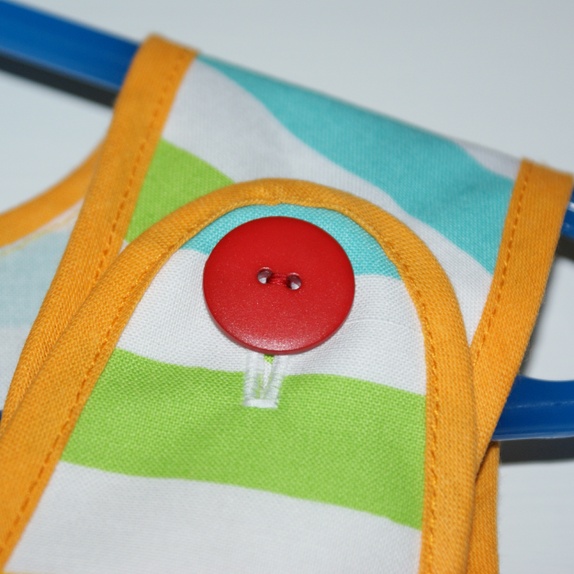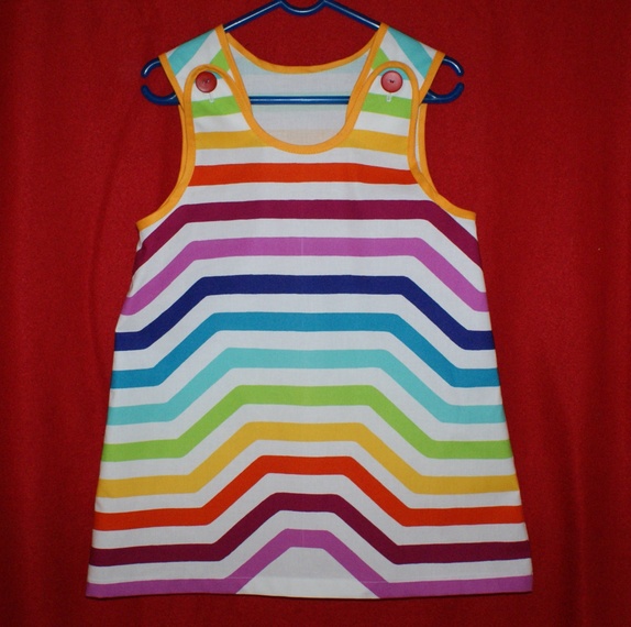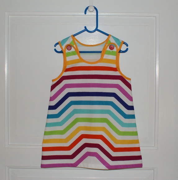 Kjole i et morsomt, stripete bomullsstoff fra Marimekko. Kjolen er kantet med skråbånd øverst og har knepping på skuldrene.