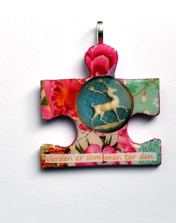 Dette anhenget består av en puslespill brikke som er dekorert med forskjellige ting som feks papir utklipp, servietter og bånd for å skape en liten unik og dekorativ collage.