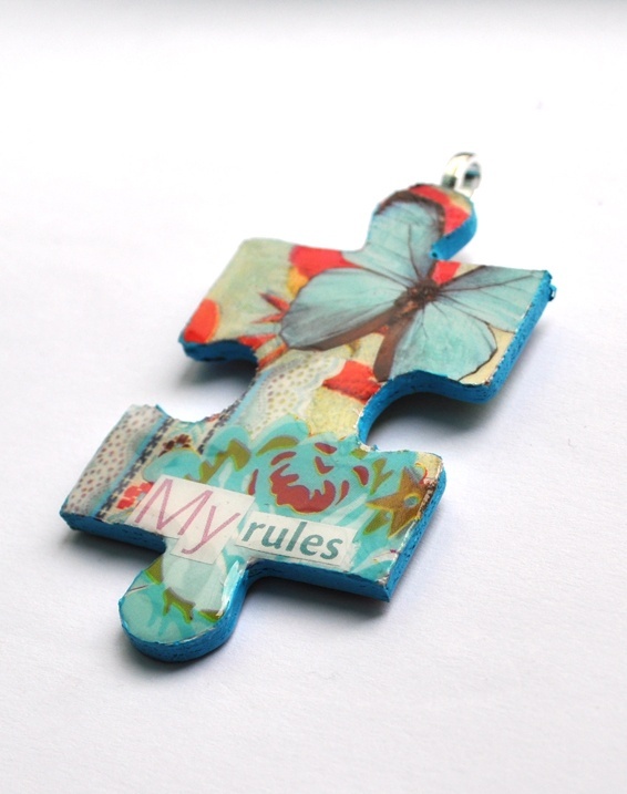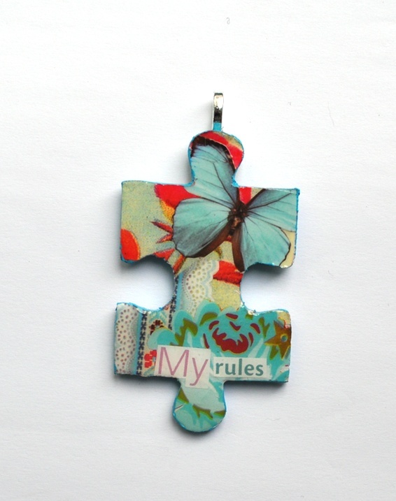 Dette anhenget består av en puslespill brikke som er dekorert med forskjellige ting som feks papir utklipp, servietter og bånd for å skape en liten unik og dekorativ collage.