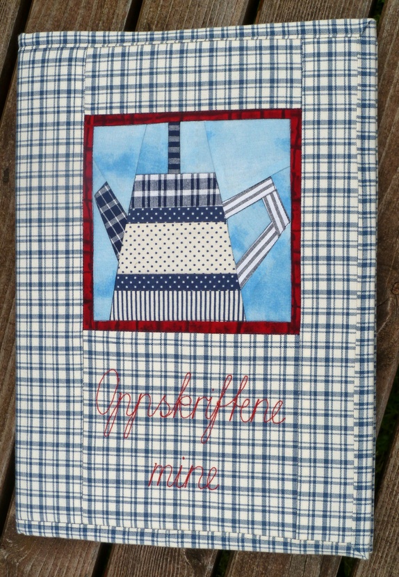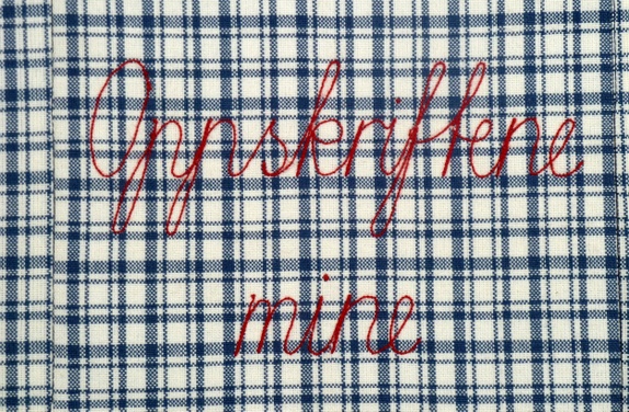 På framsida er teksta "Oppskriftene mine" frihandsbrodert med raud tråd.
