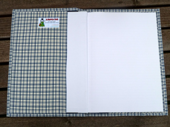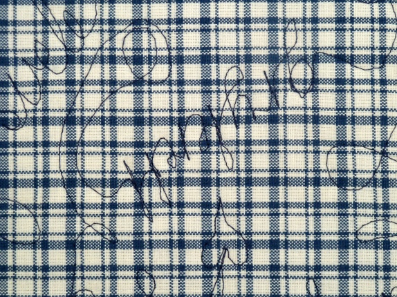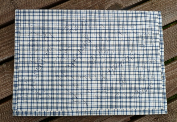 På baksida er nokre "matord" frihandsbrodert med blå tråd.
