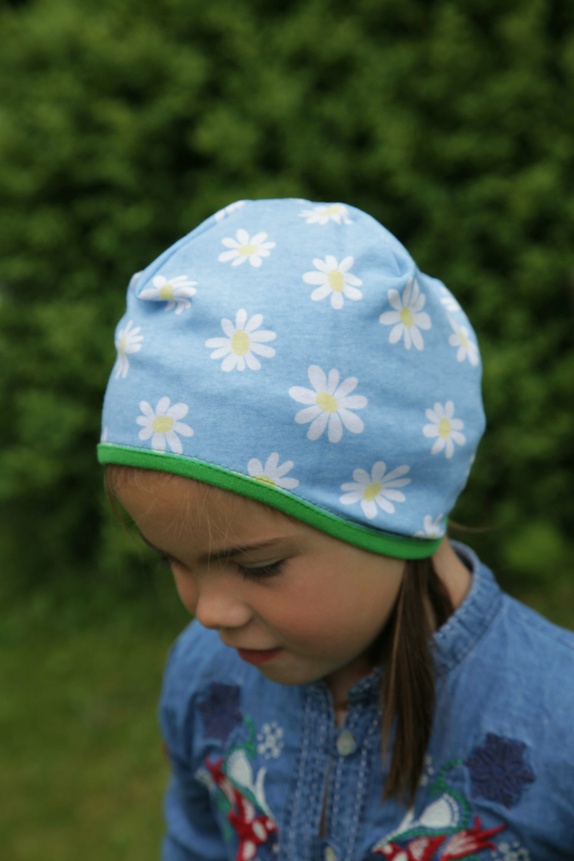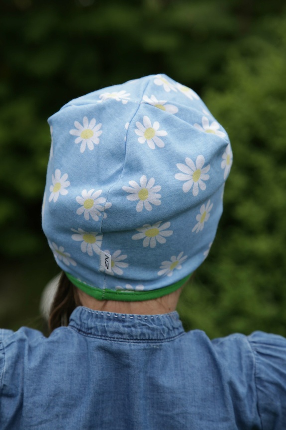 Luen er sydd i en lyseblå jersey med prestekrageblomster i hvitt og gult . Avslutningen på luen er kantet med en myk grønn jersey. Luen finnes i 4 størrelser: XS, S, M og L.