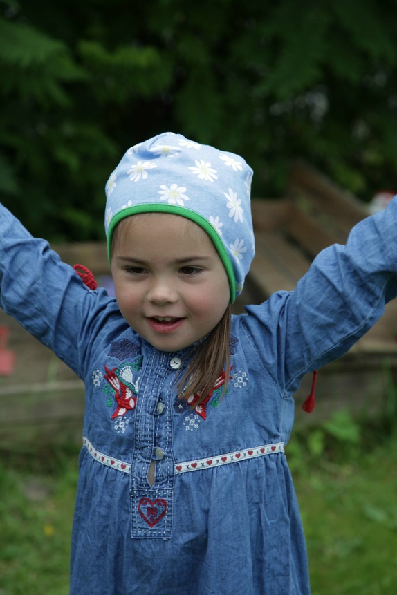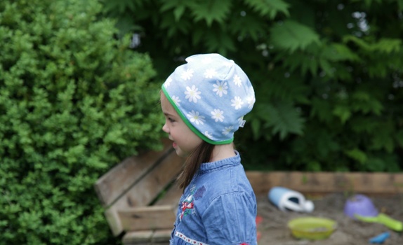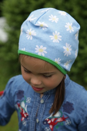 Luen er sydd i en lyseblå jersey med prestekrageblomster i hvitt og gult . Avslutningen på luen er kantet med en myk grønn jersey. Luen finnes i 4 størrelser: XS, S, M og L.