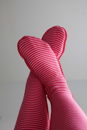 Lange, deilige knestrømper som rekker godt over knærne. De er sydd i rosa og rød, smalstripete bomullsjersey. Knestrømpene er fasongsydd med en dekorativ overlocksøm på utsiden. De finnes i 2 størrelser: 36-38 og 39-41.