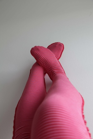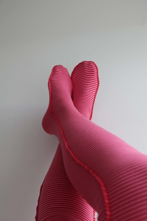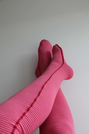 Lange, deilige knestrømper som rekker godt over knærne. De er sydd i rosa og rød, smalstripete bomullsjersey. Knestrømpene er fasongsydd med en dekorativ overlocksøm på utsiden. De finnes i 2 størrelser: 36-38 og 39-41.