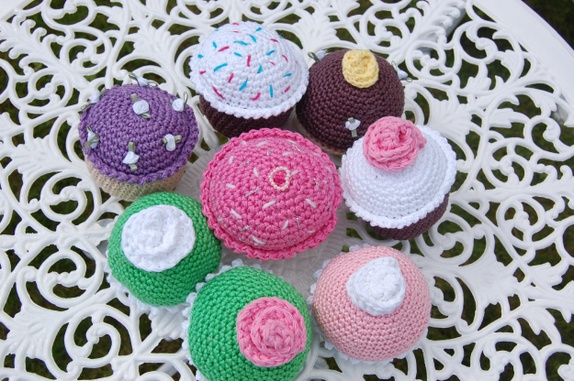 Små søte cupcakes heklet i bomullsgarn.Fylt med vatt.De kan brukes til pynt eller til nåleputer.Velg farge