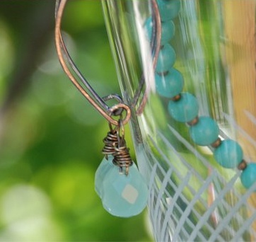 Søte øreringer i 925 antikksølv med en lys sjøskumgrønn quartzglassdråpe.