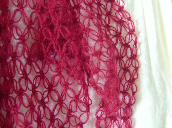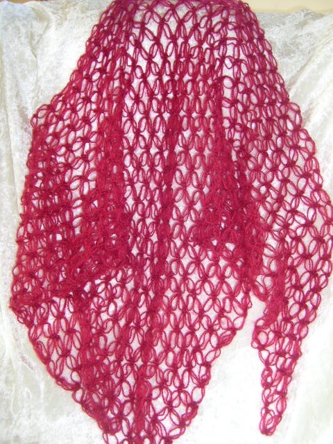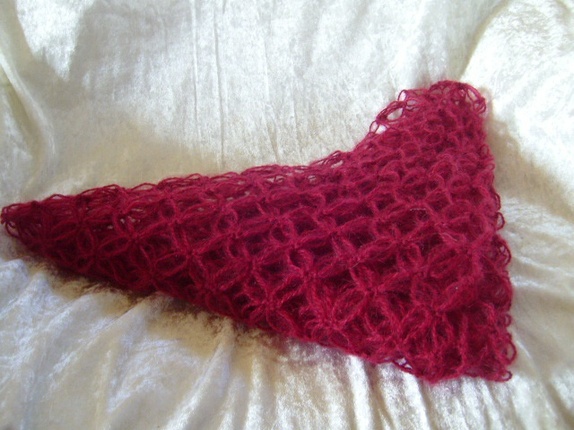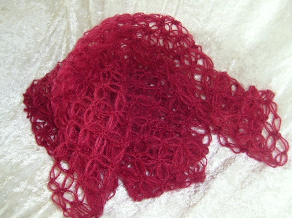 Et herlig og mykt englemaskesjal heklet i nydelig mohair i en flott burgunderrød farge. Et kjempedeilig og lett sjal å kaste over skuldrene eller ha rundt halsen som skjerf.