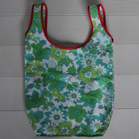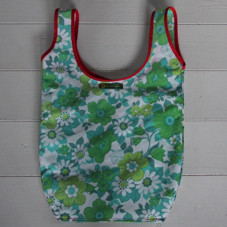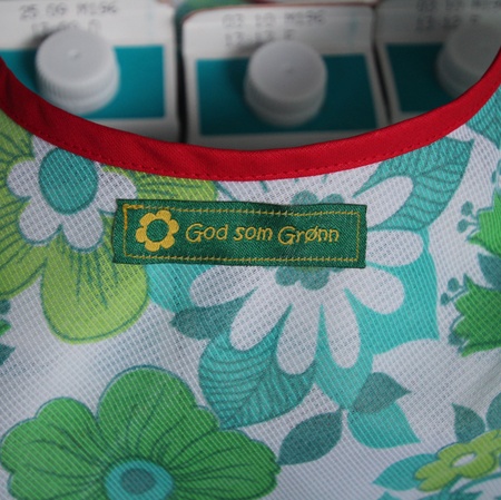 Denne er sydd av en skikkelig syntetisk gardinkappe overstrødd med grønne blomster. Langs hankene er det rødt skråbånd og på baksiden God som Grønn-merkelapp.