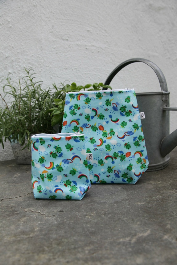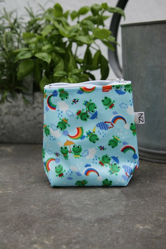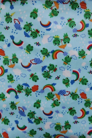 Liten pung sydd i et lyseblått voksdukmateriale med fargerike frosker i grønt, litt skyer, en paraply og regnbuer i blått, gult, oransje, rødt og hvitt.