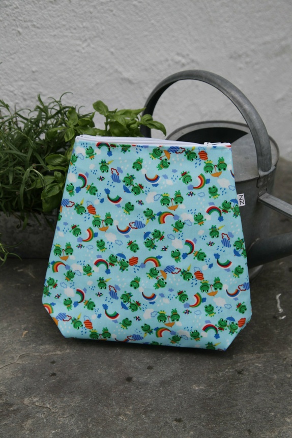 Toalettmappe sydd i et lyseblått voksdukmateriale med fargerike frosker i grønt, litt skyer, en paraply og regnbuer i blått, gult, oransje, rødt og hvitt. Mappen har en glidelåsåpning på 20 cm.