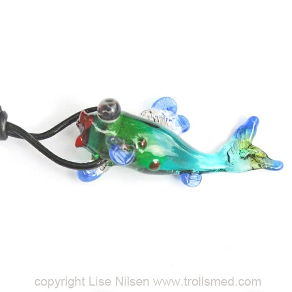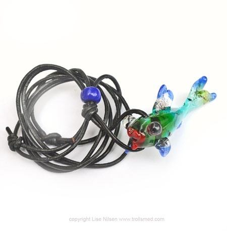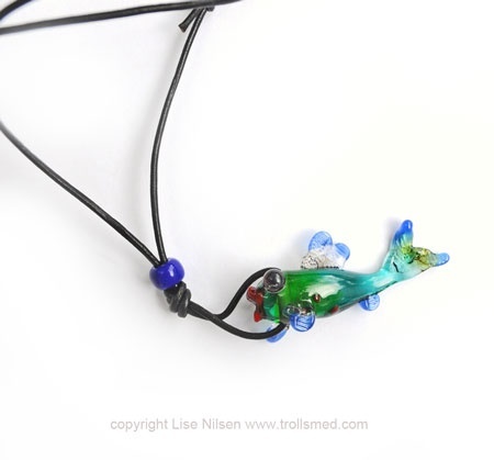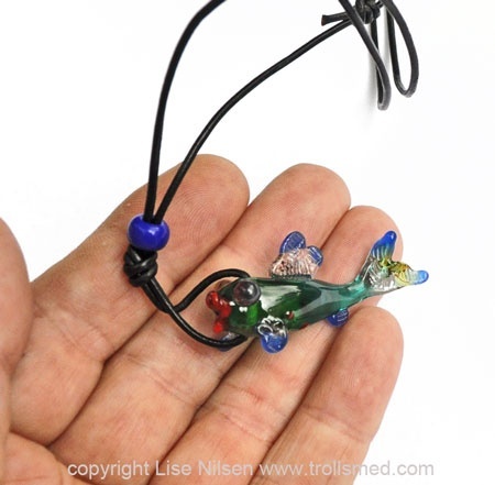 Turkisgrønn kyssefisk - smykke, håndlaget glassfisk i lærsnor